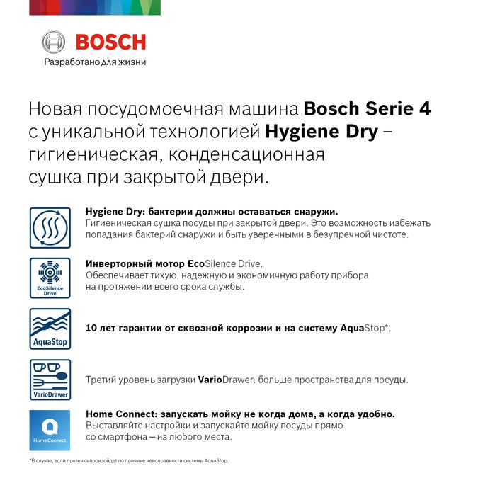 Особенности модели | цвет панели управления: белый, Нет возможности доукомплектовать декоративными рамами, технология сушки HygieneDry позволяет сушить посуду гигиенично при закрытой двери, функция HygienePlus уничтожает до 99.99% бактерий, гарантия 10 лет от сквозной коррозии, технология Home Connect с поддержкой Яндекс Алисы, система AquaStop, бесщёточный мотор нового поколения EcoSilence Drive™ |